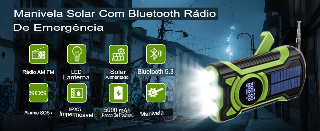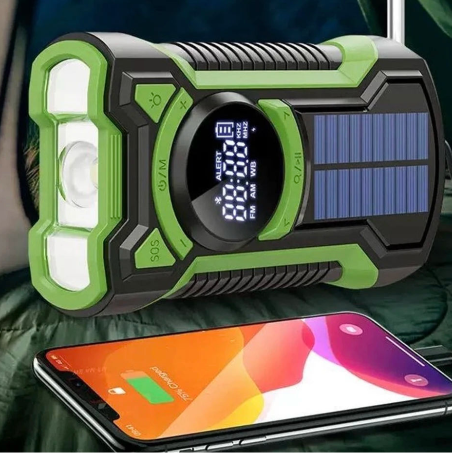 O banco de energia mais vendido na Europa e na América do norte. Equipado com: Rádio com Manivela e Energia Solar FM/AM, Rádio com Bateria de 5000mAh com Bluetooth e ATS, Rádio de Emergência à Prova d'Água com Lanterna de LED e Alarme SOS para Falta de Energia e Atividades ao Ar Livre